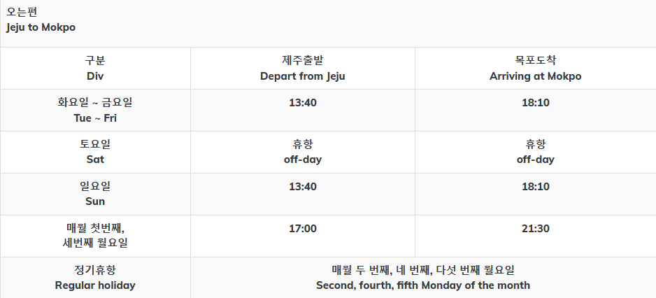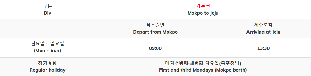 목포에서 제주가는 배편은 매월 첫번째, 세번째, 월요일이 정기휴항입니다.