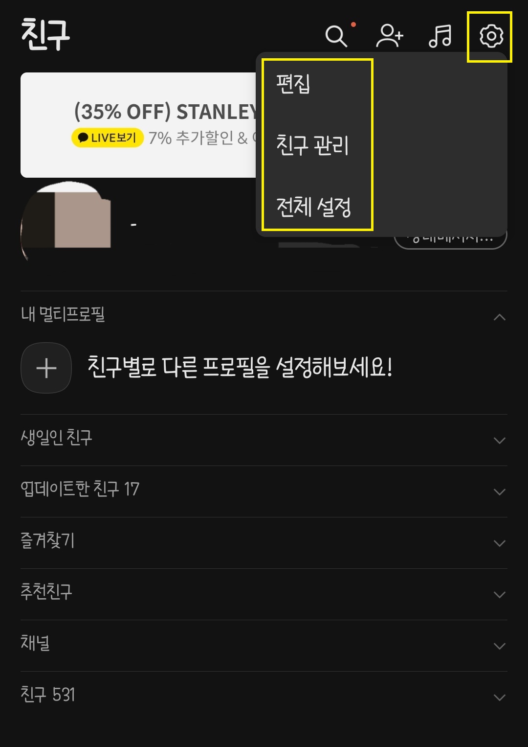 카카오톡 메인홈 우측상단 톱니바퀴를 눌러주시고 친구관리로 들어갑니다.