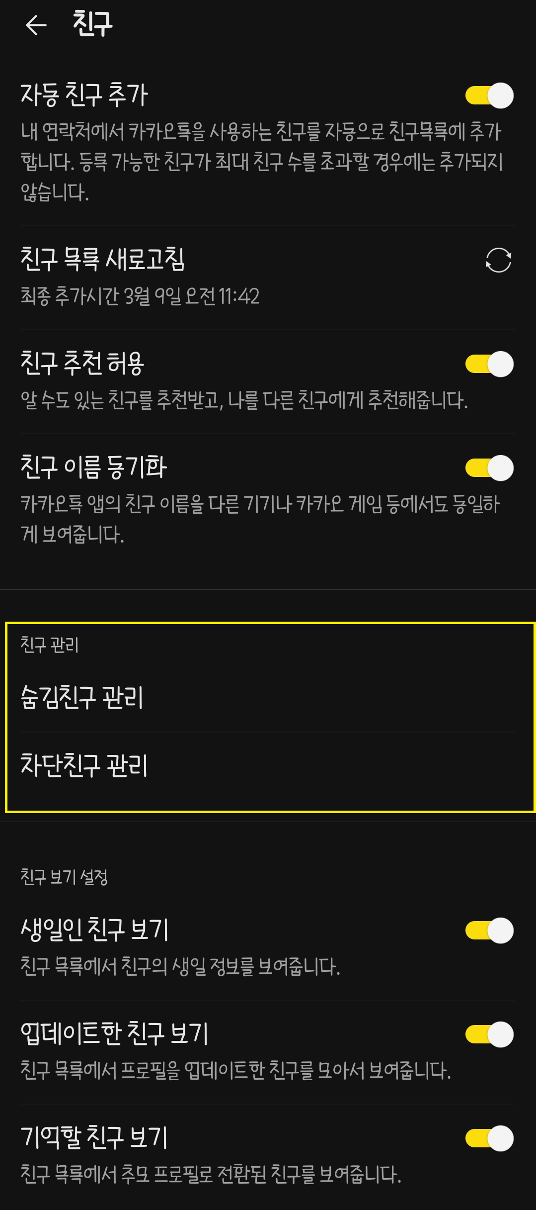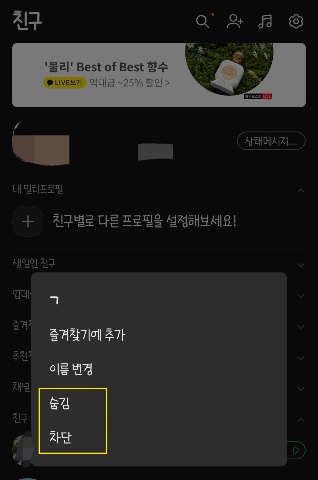 마지막으로 숨김 및 차단 친구 관리입니다.